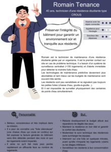 Pourquoi ce choix ? Nous avons voulu creuser une cible qui voyait le côté économique plutôt qu’écologique. Un propriétaire multi-logement est une cible idéale, directement inspiré de nos interview. Ce profil est, selon nous, touché, notamment par l’aspect économique. En effet : les bailleurs sont motivés par la réduction des coûts de gestion et la prévention des sinistres (fuites non détectées provoquant de lourdes factures).