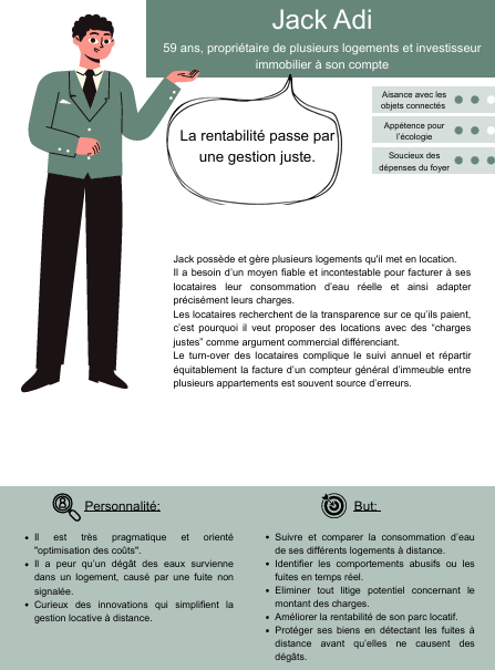 Pourquoi ce choix ? Nous avons voulu creuser une cible qui voyait le côté économique plutôt qu’écologique. Un propriétaire multi-logement est une cible idéale, directement inspiré de nos interview. Ce profil est, selon nous, touché, notamment par l’aspect économique. En effet : les bailleurs sont motivés par la réduction des coûts de gestion et la prévention des sinistres (fuites non détectées provoquant de lourdes factures).