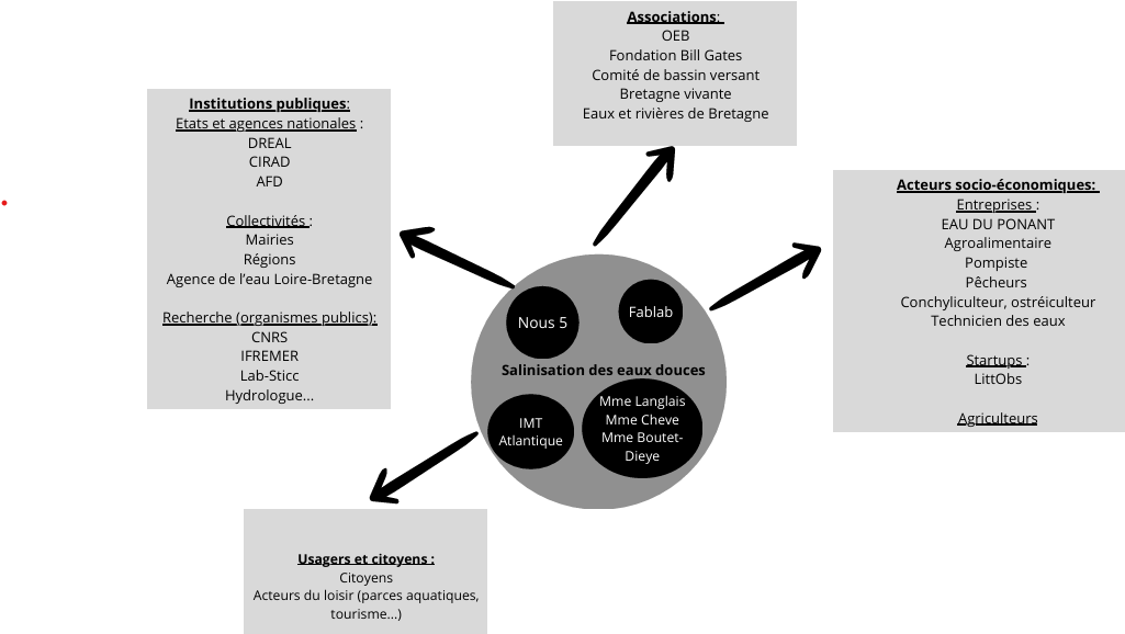 Notre réflexion s’est initialement portée sur la salinisation des eaux douces, un phénomène qui menace la qualité et la disponibilité de la ressource. Ce problème, directement lié aux activités humaines (pompages excessifs, urbanisation, pratiques agricoles) et accentué par le changement climatique (sécheresses, montée du niveau de la mer), représente un risque silencieux mais préoccupant pour l’approvisionnement en eau potable. Nous avons effectué une enquête terrain auprès de chercheurs, d’associations et d’entreprises. La plupart de nos contacts proviennent du réseau de l’école ou bien de connaissances. Nous avons également contacté via mails et téléphone les différents acteurs afin de convenir d’un rendez-vous, en présentiel ou en visioconférence.