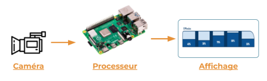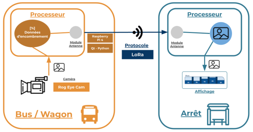 La caméra qui est positionnée dans chaque wagon du transport compte les personnes et les compare avec le nombre maximum permis. Pour ce projet, on a estimé que dans chaque wagon de tramway, il y a maximum 30 personnes dans chaque wagon selon l’enquête de terrain faite et le recherche sur les capacités communes en France. Du coup, on obtient le pourcentage d’encombrement à afficher après.