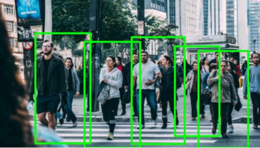 Il y a plusieurs méthodes de reconnaissance d’encombrement avec le traitement des images [4][5][6]. En trouvant la méthode appropriée, on a choisi le reconnaissance des silhouettes des personnes puisqu’il permet d’obtenir un nombre des personnes dans chaque wagon avec un certaine exactitude. Des autres méthodes comme le compteur de personnes qui entrent et sortent et la reconnaissance faciale sont exclus. L’image ci-dessous est un exemple de l’ image et le nombre de silhouettes reconnues avec la caméra [7].
