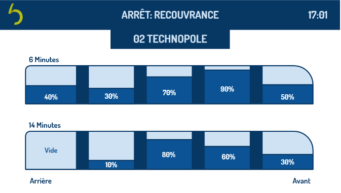 Le image ci-dessus montre comme d’une manière graphique, le remplissage de chaque wagon correspond avec le pourcentage d’encombrement qui va être actualisé à chaque minute.