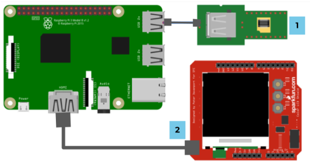 - Connecter la caméra et l’affichage au processeur via HDMI et USB. Ci-dessous, l’image qui représente la connexion de la caméra «1» et l’affichage «2»