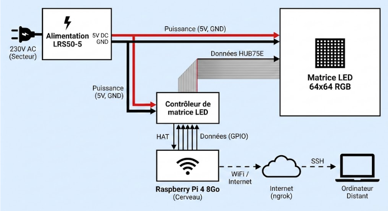 • Rôle : Convertit le courant secteur (230V) en 5V continu nécessaire pour alimenter la matrice LED. Elle est branchée directement sur une prise secteur.