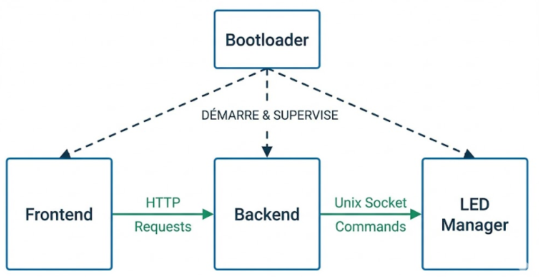 • LED Manager Service : Tourne en tant que root (nécessaire pour accéder aux GPIO), contrôle directement la matrice LED et écoute les commandes sur un socket Unix.