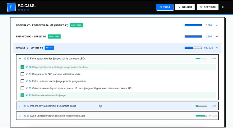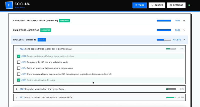 Nous avons donc recentré notre projet sur ce qui le rend unique : la visualisation physique de la progression. Focus importe les données depuis Taïga et se concentre sur l’affichage, pas sur la gestion. C’est un complément aux outils existants, pas un remplaçant.