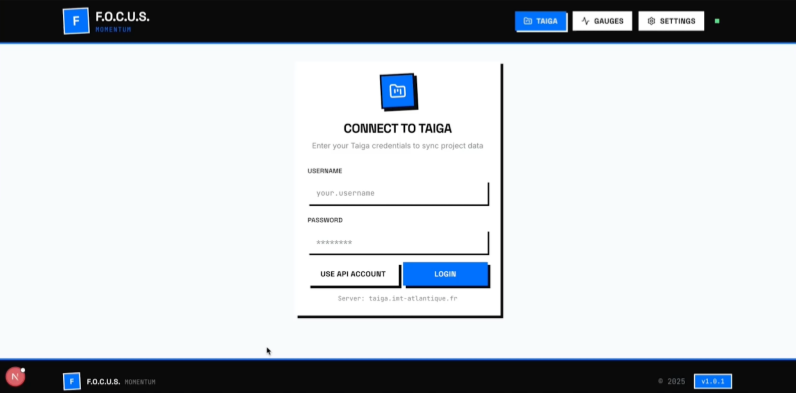• Étape 1 – Connexion : L’utilisateur accède à l’interface web de Focus, entre ses identifiants Taïga et sélectionne son projet.