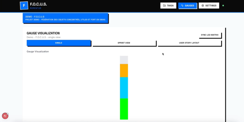 Des outils de gestion de projet comme Taïga sont très aboutis et les recréer n’apporterait pas de valeur. Focus apporte une valeur ajoutée par sa visualisation physique, permettant aux équipes de garder leurs habitudes (Taïga) tout en bénéficiant du panneau LED.