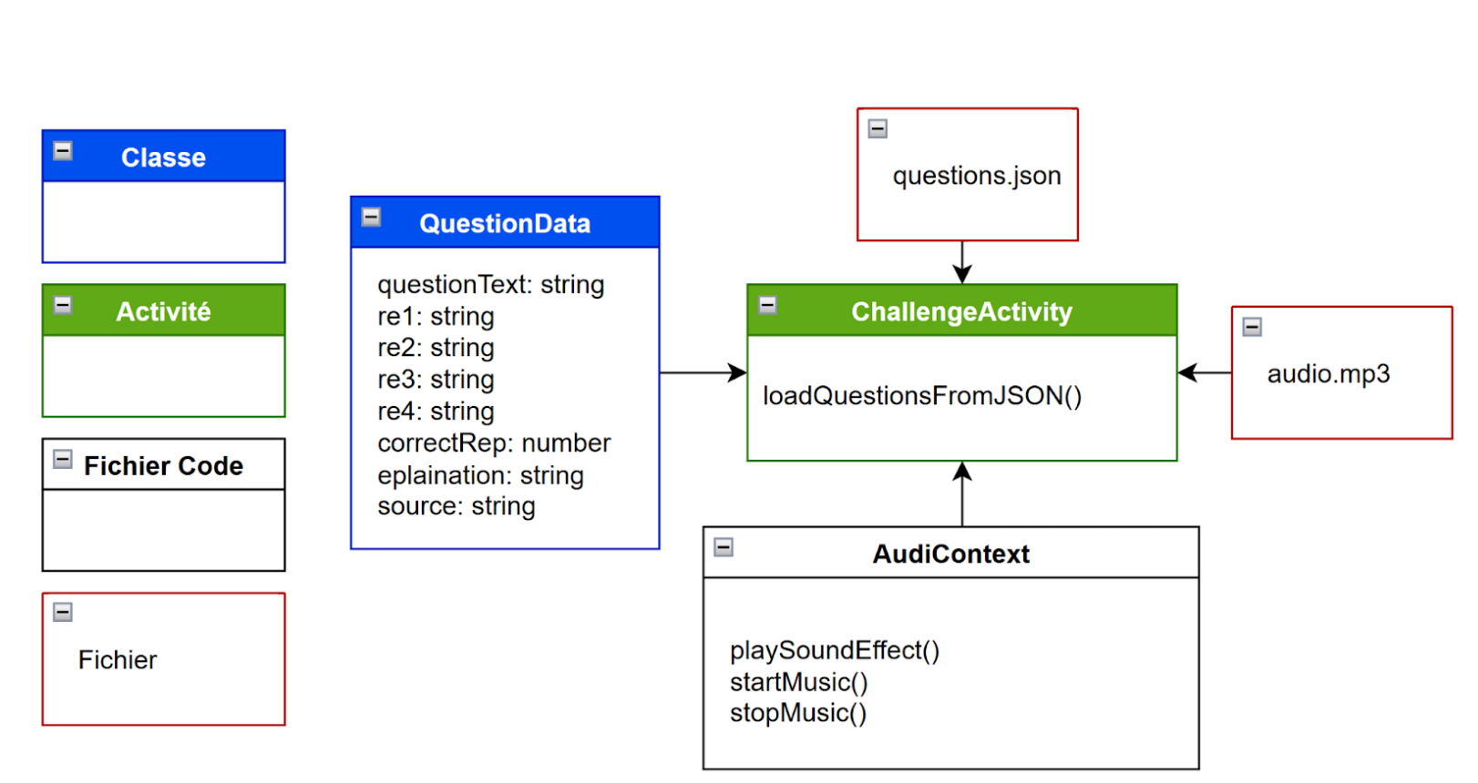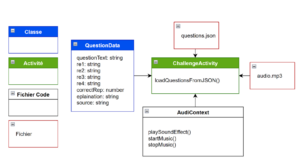 C’est ce contenu, désormais structuré et facilement administrable au format JSON, qui est mis en œuvre : les informations sont directement récupérées, grâce à la fonction loadQuestionsFromJson, par l’activité ChallengeActivity.