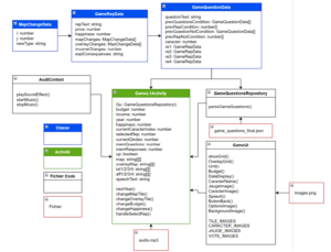 Une question particulière nommée explication permet l’affichage des explications des conséquences aux réponses choisies. Elle est repérée par le code car c’est la seule à utiliser le personnage numéro 0 (la présentatrice). La liste de questions alterne une question réelle et une explication. La liste de questions est ensuite appelée dans GameL1Activity qui affiche l’interface du jeu.