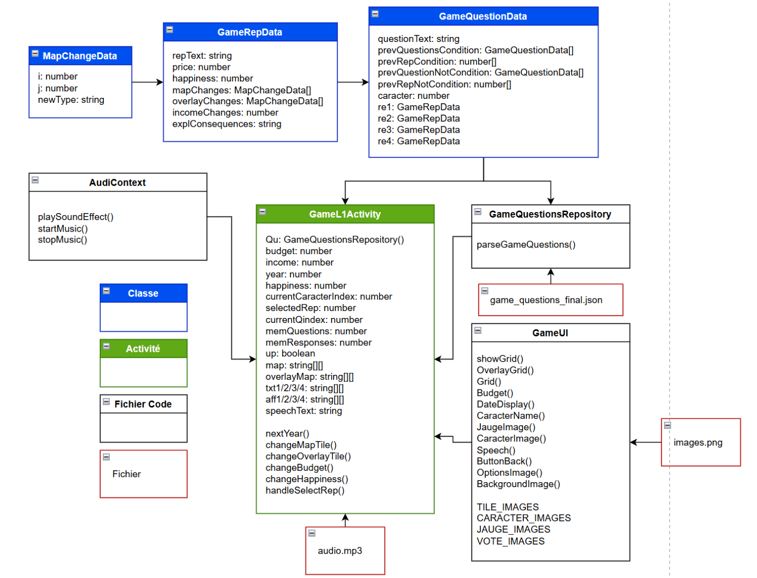 Les fonctions d’affichage du jeu sont communes à tous les niveaux existants (un seul pour l’instant) et sont répertoriées dans le fichier tsx GameUI. Ce dernier importe directement les ressources graphiques (images des personnages, jauges, tuiles de carte, etc.) depuis les assets. En revanche, les fichiers audios sont appelés directement depuis GameL1Activity. Ce choix a été fait car ils sont exclusivement déclenchés par la modification des variables d’état de l’activité (comme le budget ou la carte) et non par l’interface d’affichage elle-même. Leur lecture est assurée par des fonctions provenant du tsx AudioContext, le même module que celui utilisé pour la partie “Défis”.