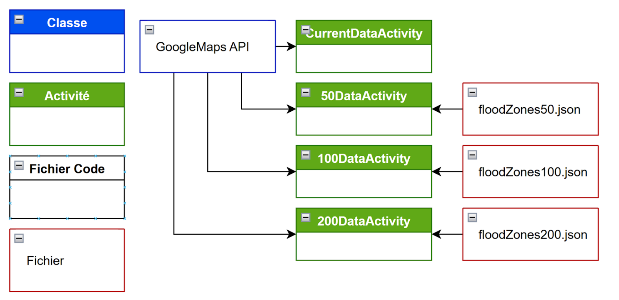 Les quatre activités sont configurées de la même manière. Elles utilisent l’API Google Maps de sorte à afficher une carte du monde sur laquelle on peut se déplacer. On en reste là pour CurrentDataActivity car il s’agit juste de l’état de la carte actuelle. Dans les trois autres cas, l’activité importe les informations d’un fichier json correspondant. Ils sont de la forme :